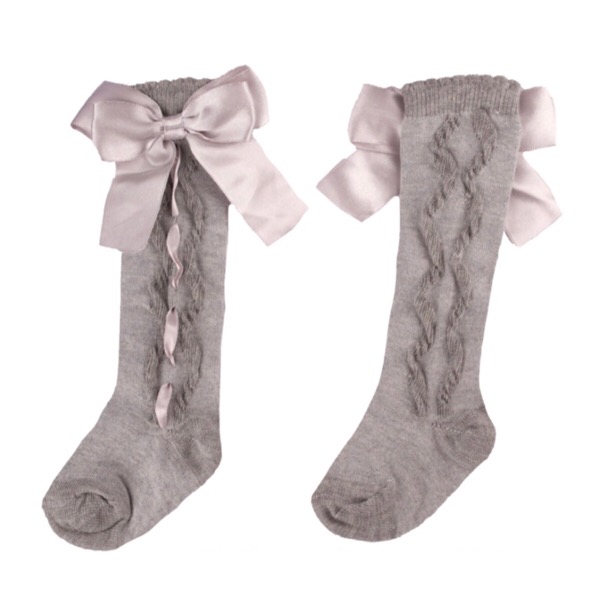 Girls knee high socks with satin ribbon & bow on the side of the leg.