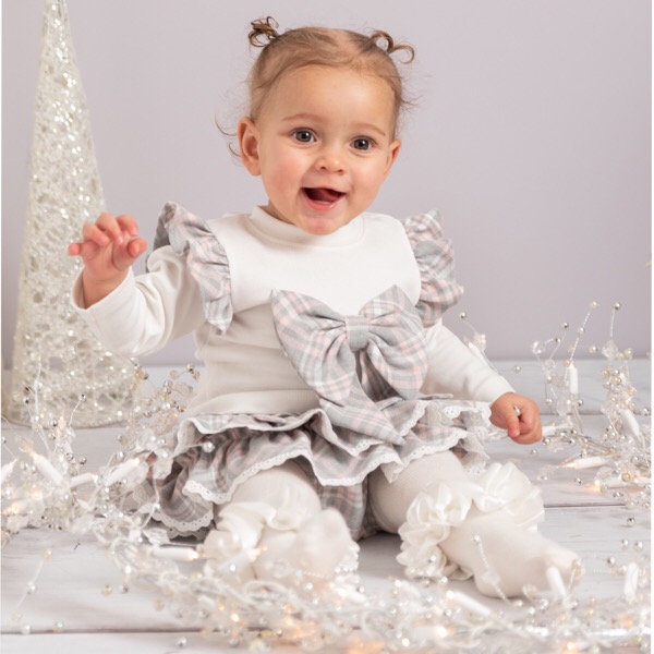 - Pink & grey check bow on the front