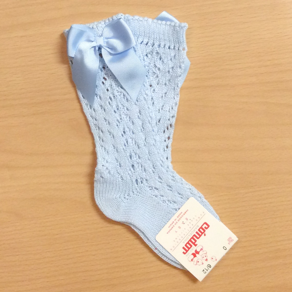 Girls open work knee high socks with a grosgrain bow on the side.