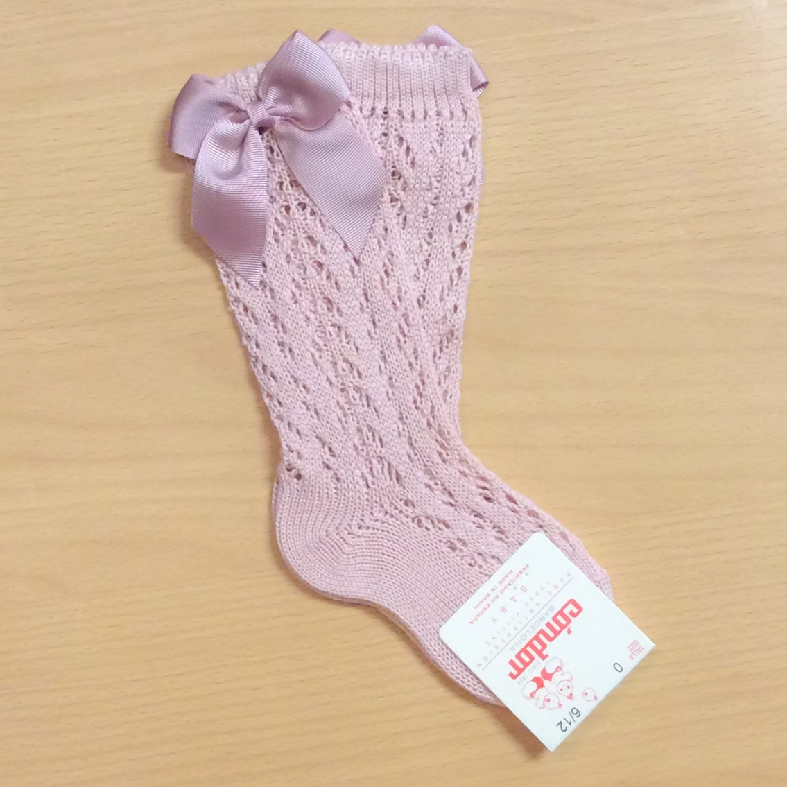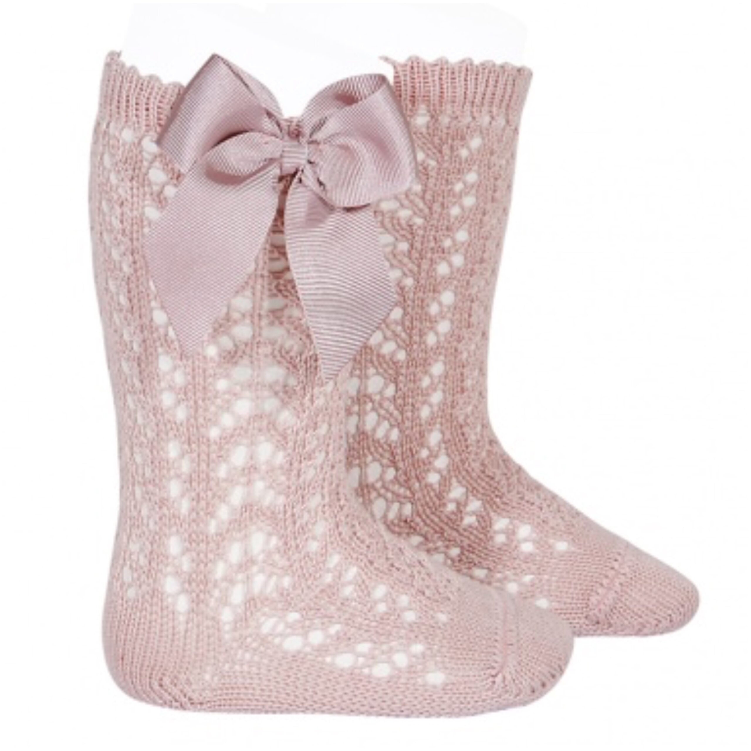 Girls open work knee high socks with a grosgrain bow on the side.