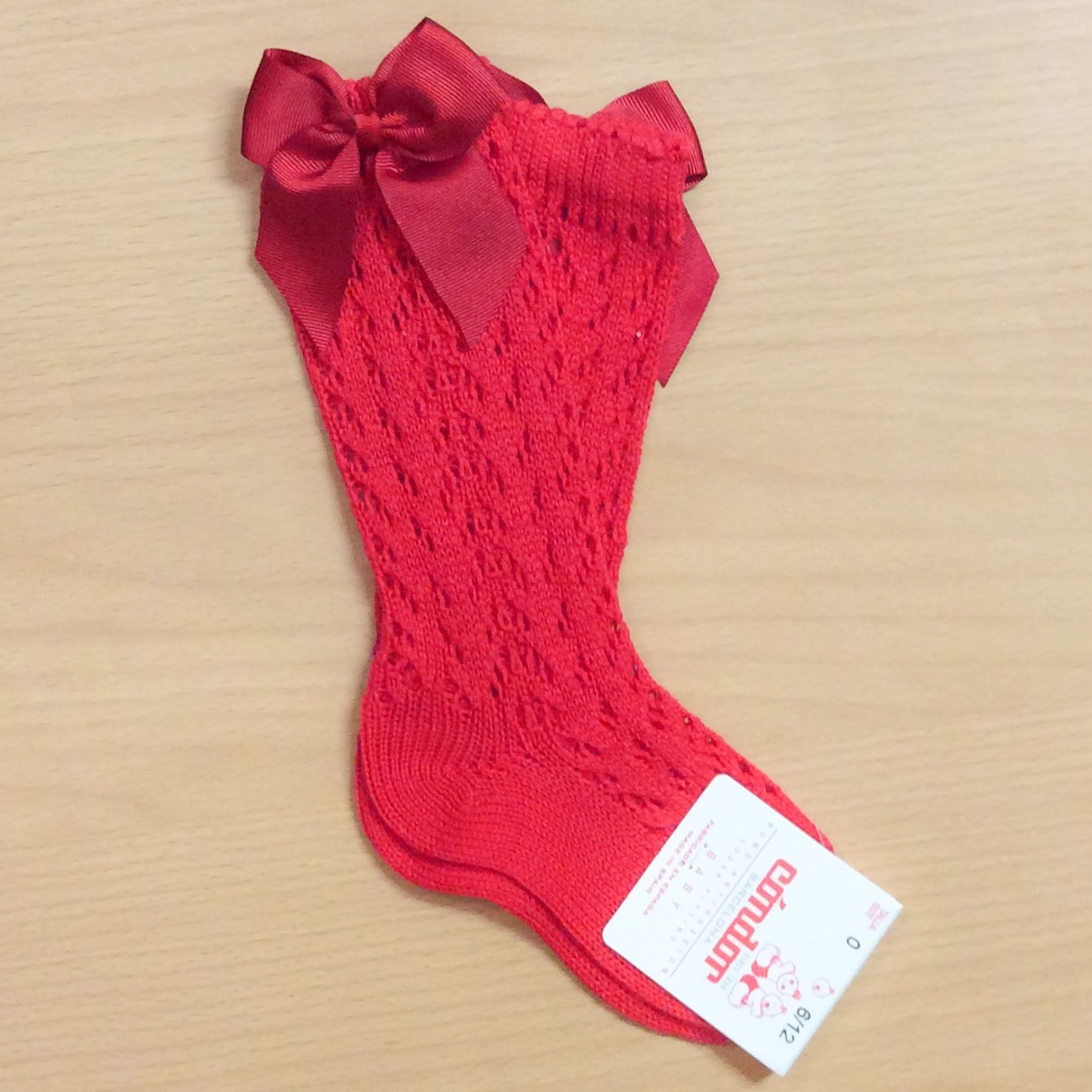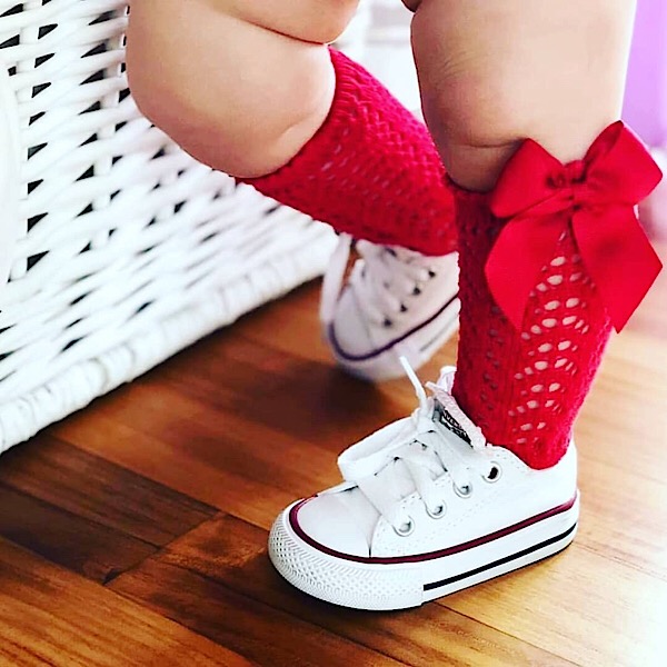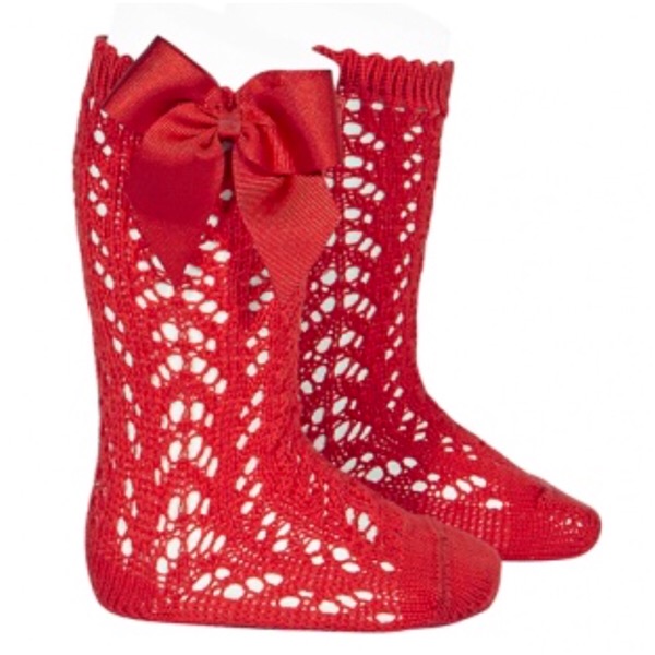Girls open work knee high socks with a grosgrain bow on the side.