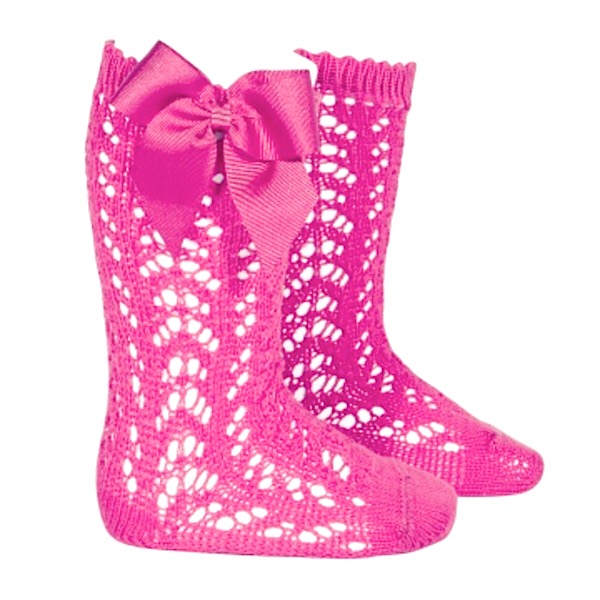 Girls open work knee high socks with a grosgrain bow on the side.