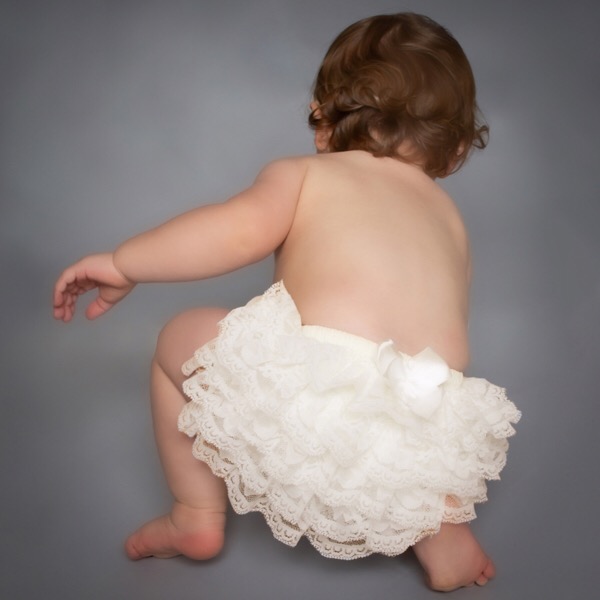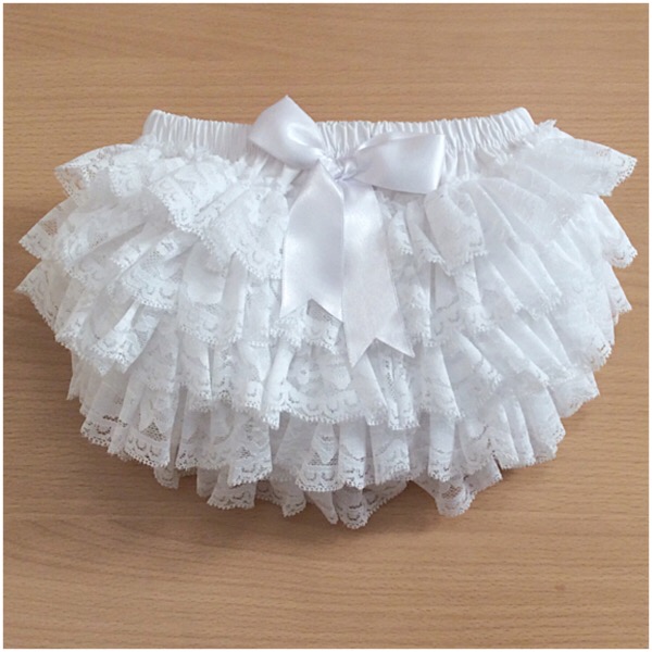 Cotton knickers with layers of lace frills on the back, finished with a satin bow.