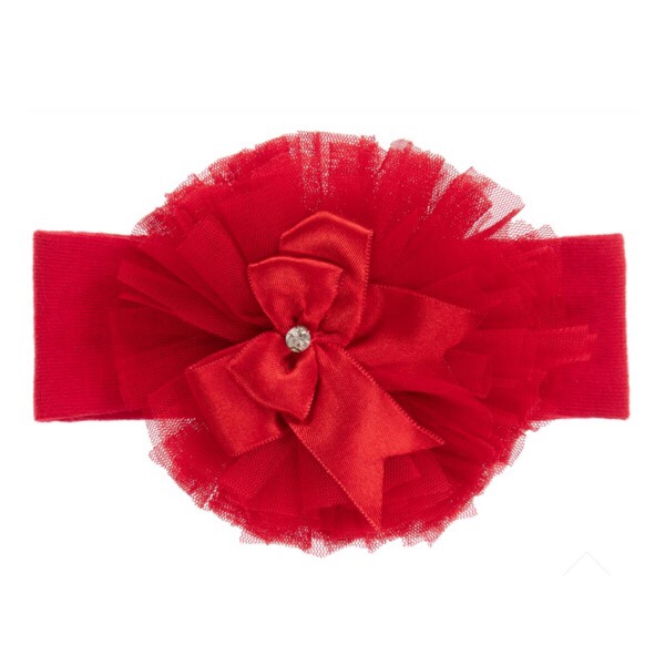 A red stretch headband with layers of tulle and a satin bow with diamonte centre.
