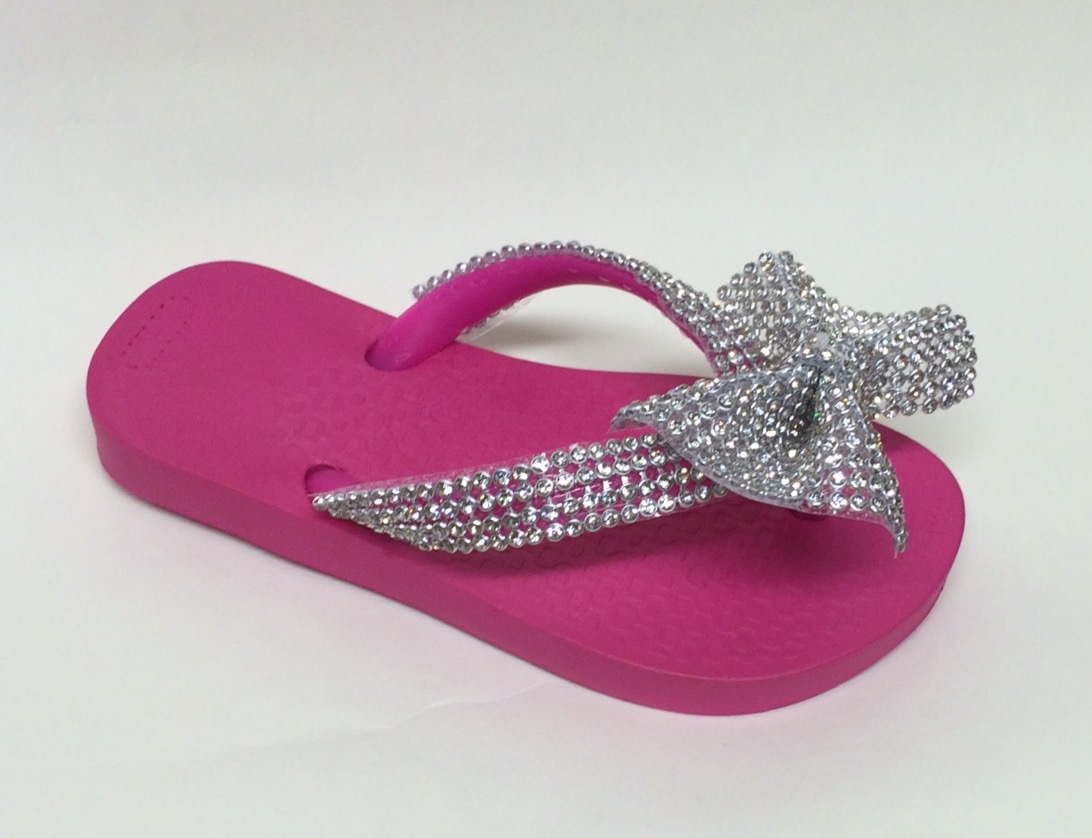 Girls pink flip flop sandals with a large crystal bow on the front.