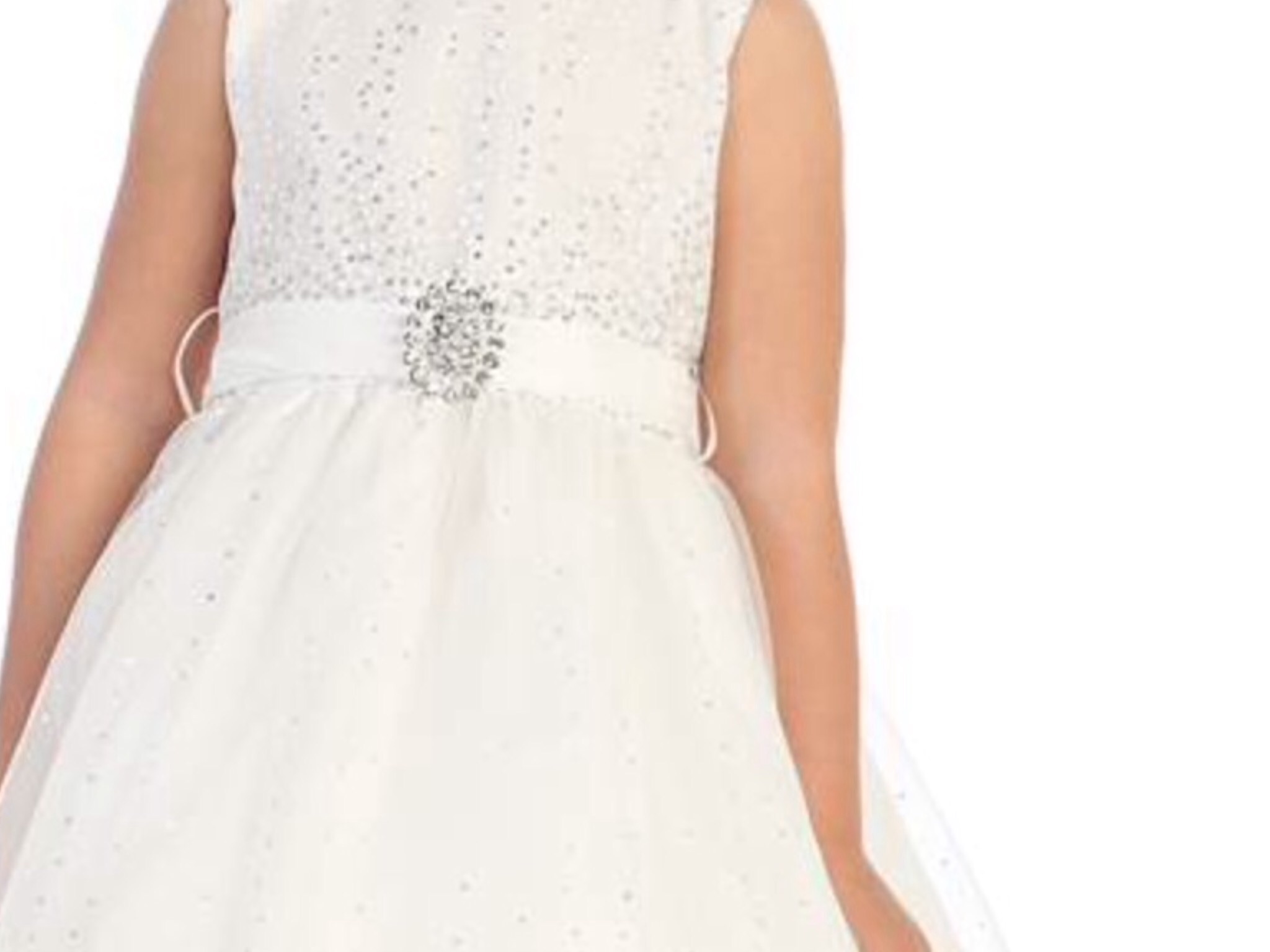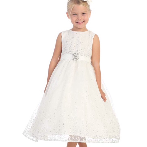 A beautiful glitter sparkle tulle dress with detachable taffeta sash and Diamonte broach.