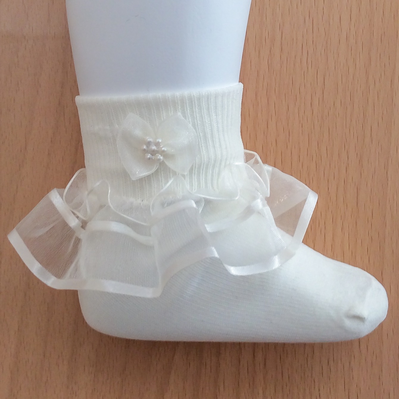 Ivory nylon socks with an ivory organza frill & small bow with pearl detail on the ankle.