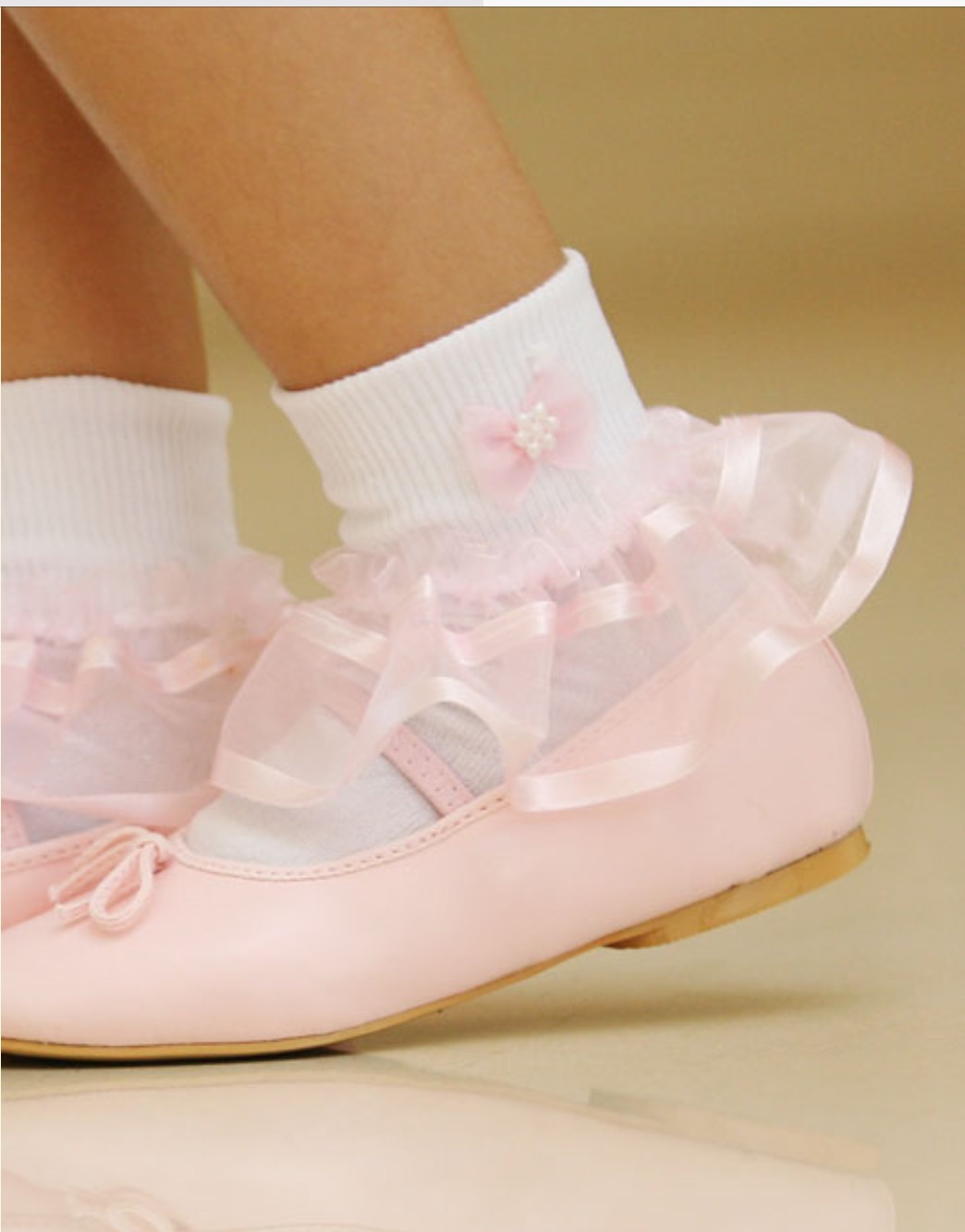 White nylon socks with a white organza frill & a small bow with pearl detail on the ankle.