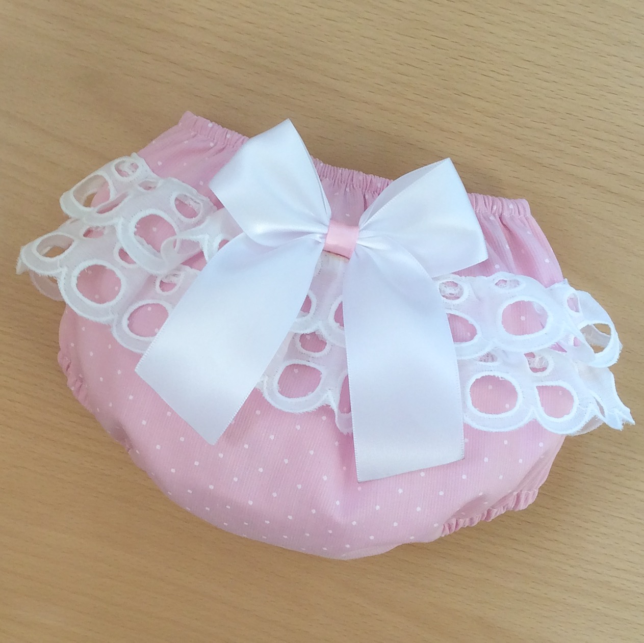 Pink & White dotty knickers with white cotton broderie anglaise frills & a white satin bow.