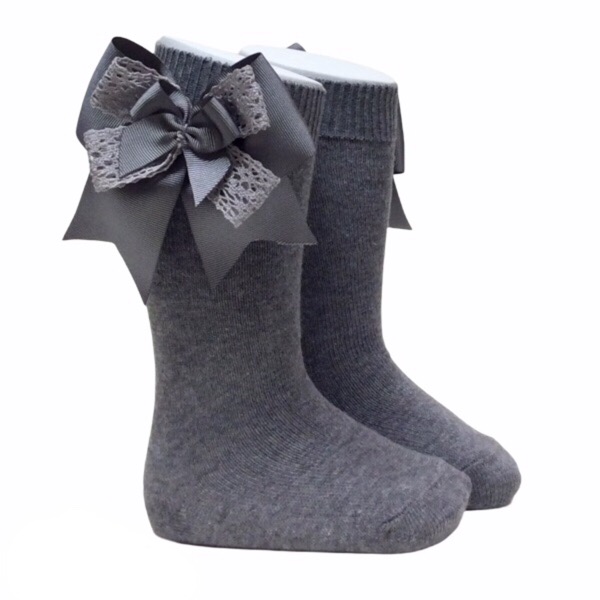 Knee length socks with a grosgrain & crochet lace bow on the side of the leg.