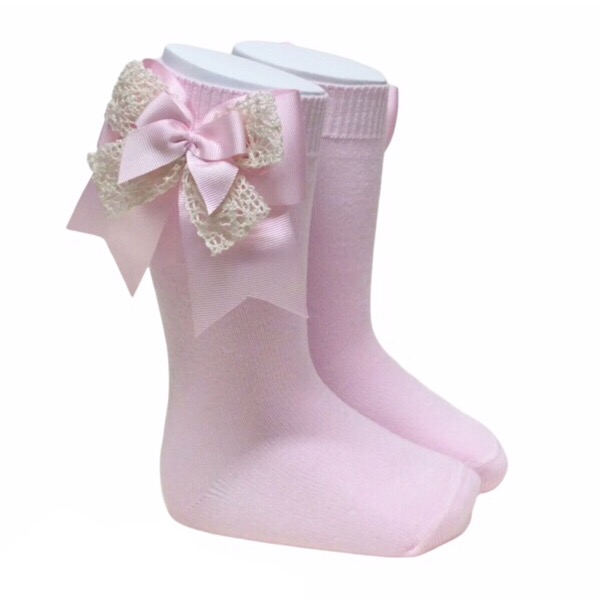 Knee length socks with a grosgrain & crochet lace bow on the side of the leg.