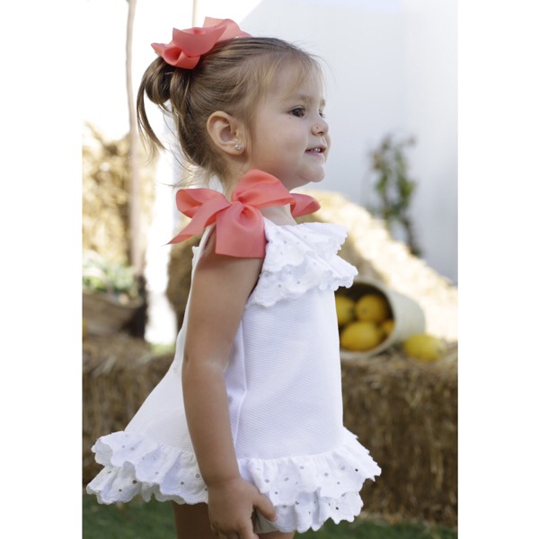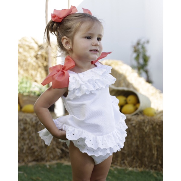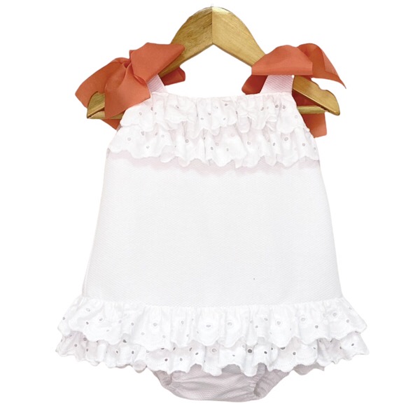 White pique cotton dress & pants set with pink bow trims