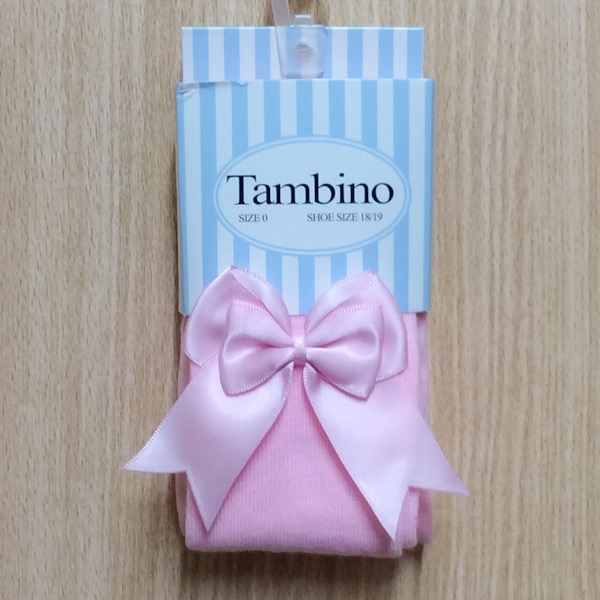 Girls pink tights with a double satin bow on the side of the leg.