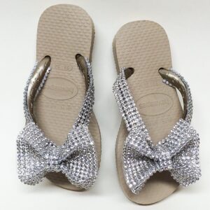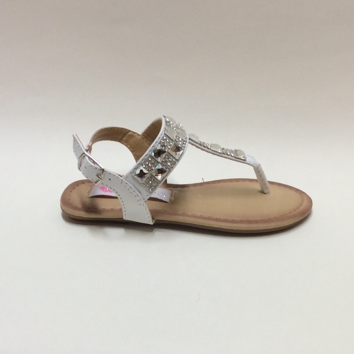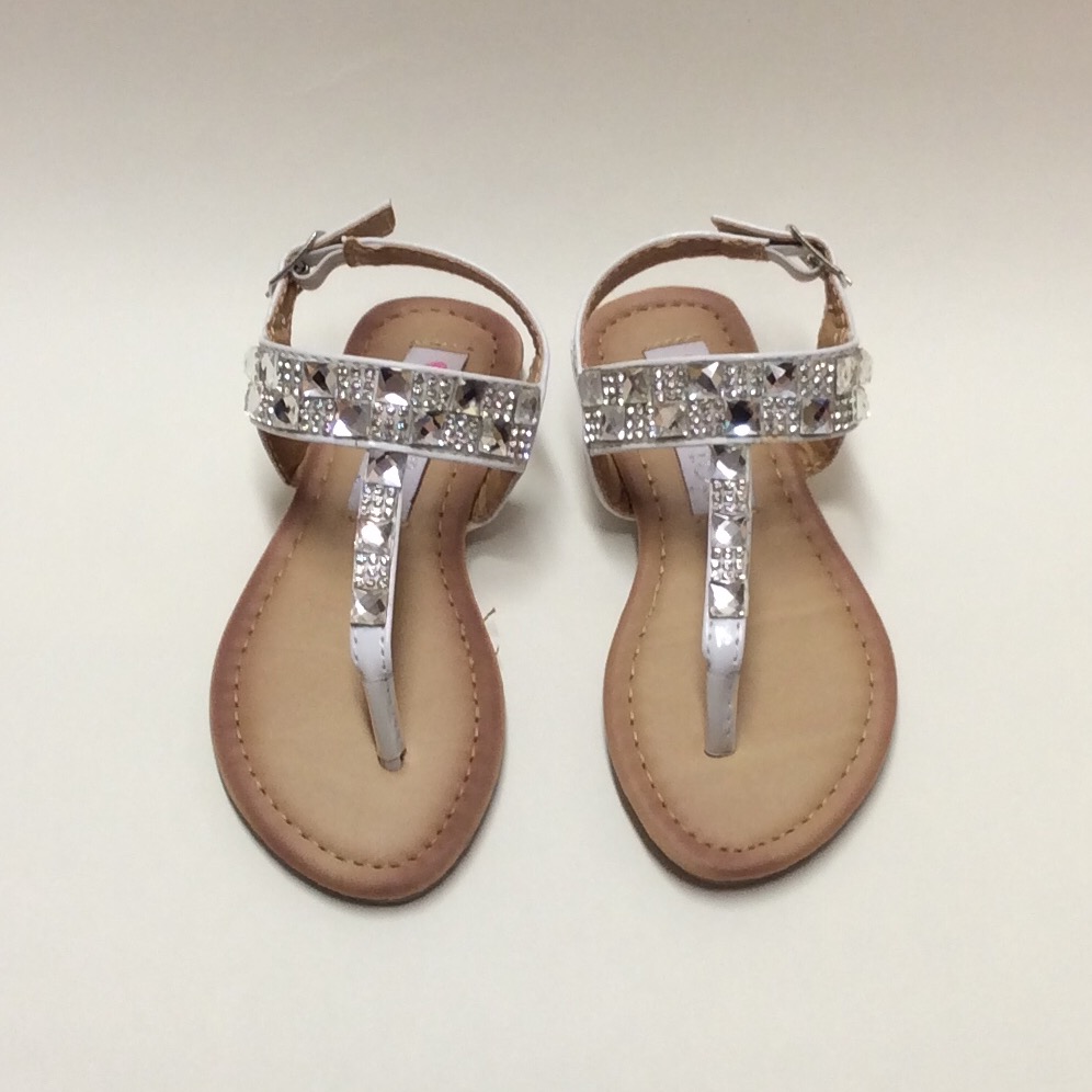 A white patent toe-post sandal with silver crystal stud detail, buckle fastening.