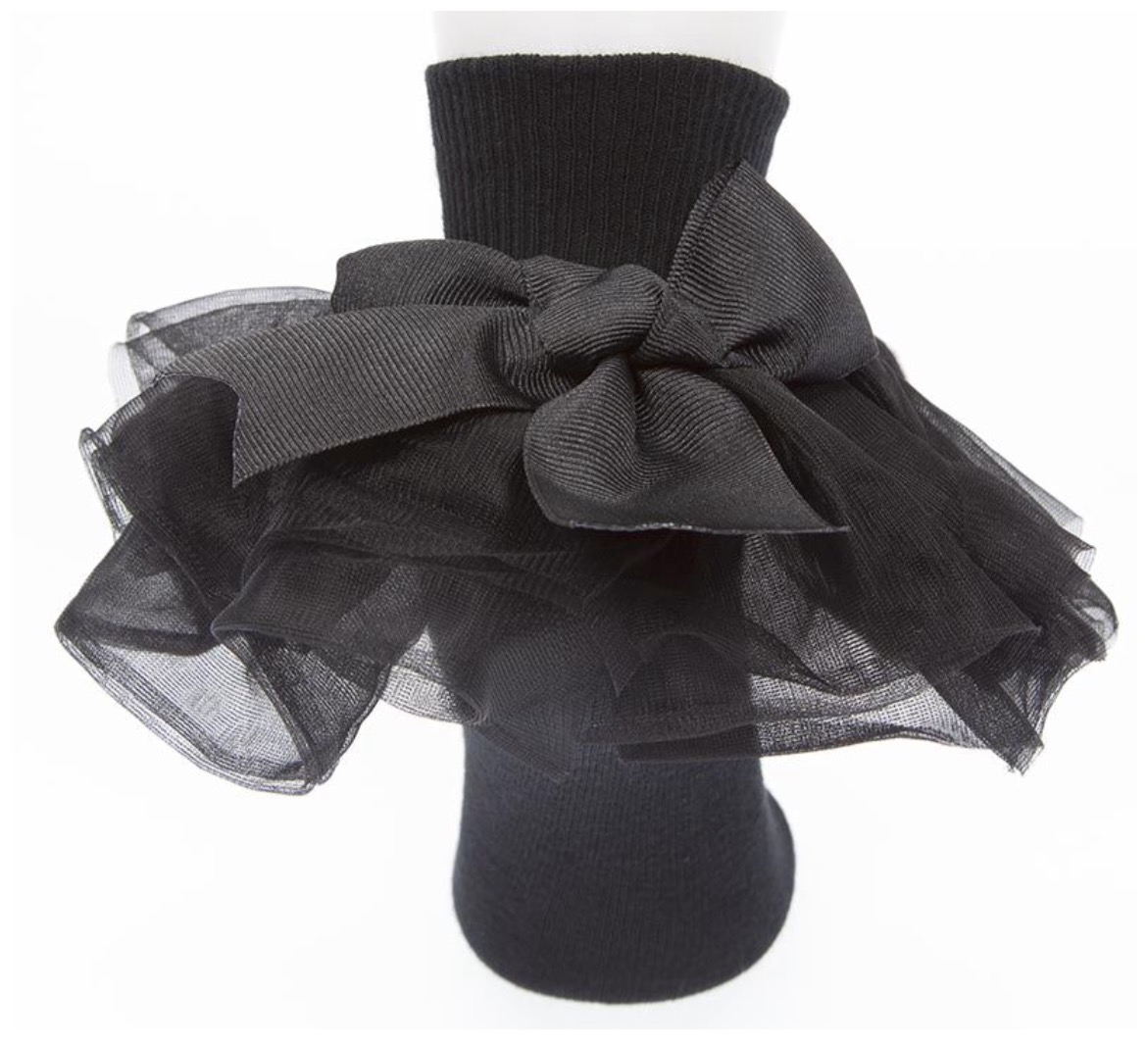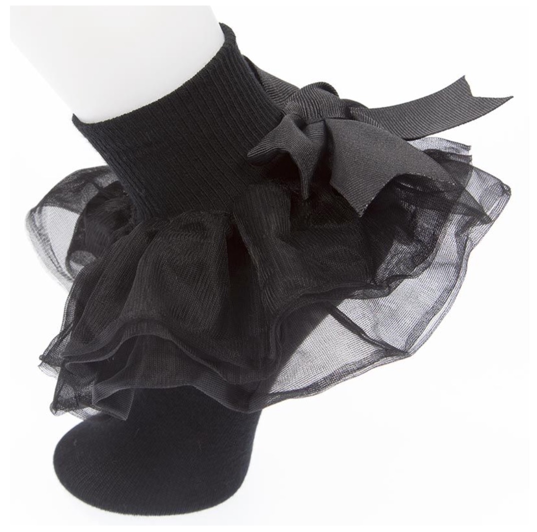 Black chiffon ruffle socks adorned with a grosgrain bow.